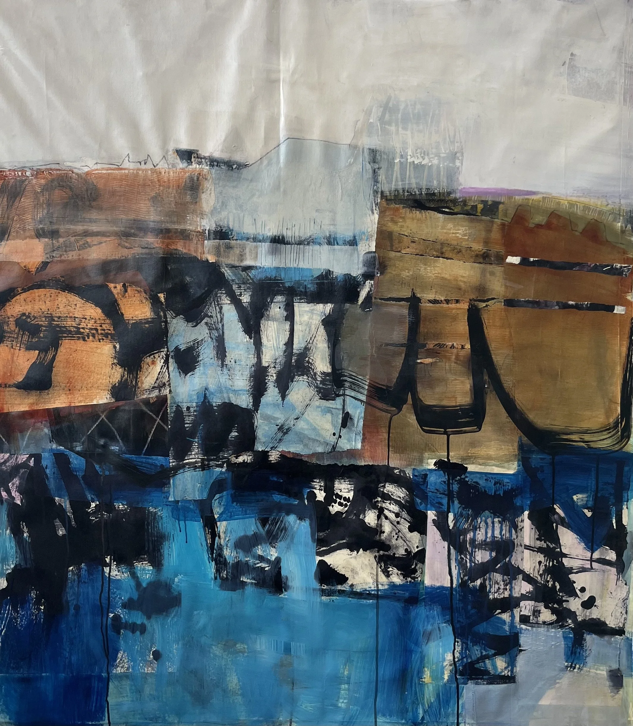 During these summer months. there has been a lull in my creative productivity. A number of factors have contributed to this, from lots of travel, to finishing edits and revisions on a book that will be published in March of 206. When I do have time to paint, I notice I am going slower. No longer in a rush, or feeling the need to please anybody, I am taking time to let paintings evolve or to leave them alone! Here are two large paintings ( the first is 50” H and 40” wide, the other is 50” square) that feel successful to me and refelct this new approach.